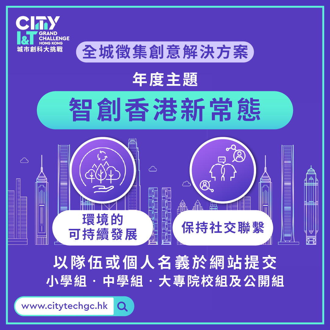 由創新科技署主辦,香港科技園協辦,GDG Hong Kong支持的「城市創科大挑戰」現邀各位參加(包括小學、中學、大專院校學生組以及公開組)在今年大挑戰的「智創香港新常態」主題,和「環境的可持續發展」和「保持社交聯繫」副題下,提出創意構思,以協助香港社會適應新的生活方式和應付未來的挑戰。